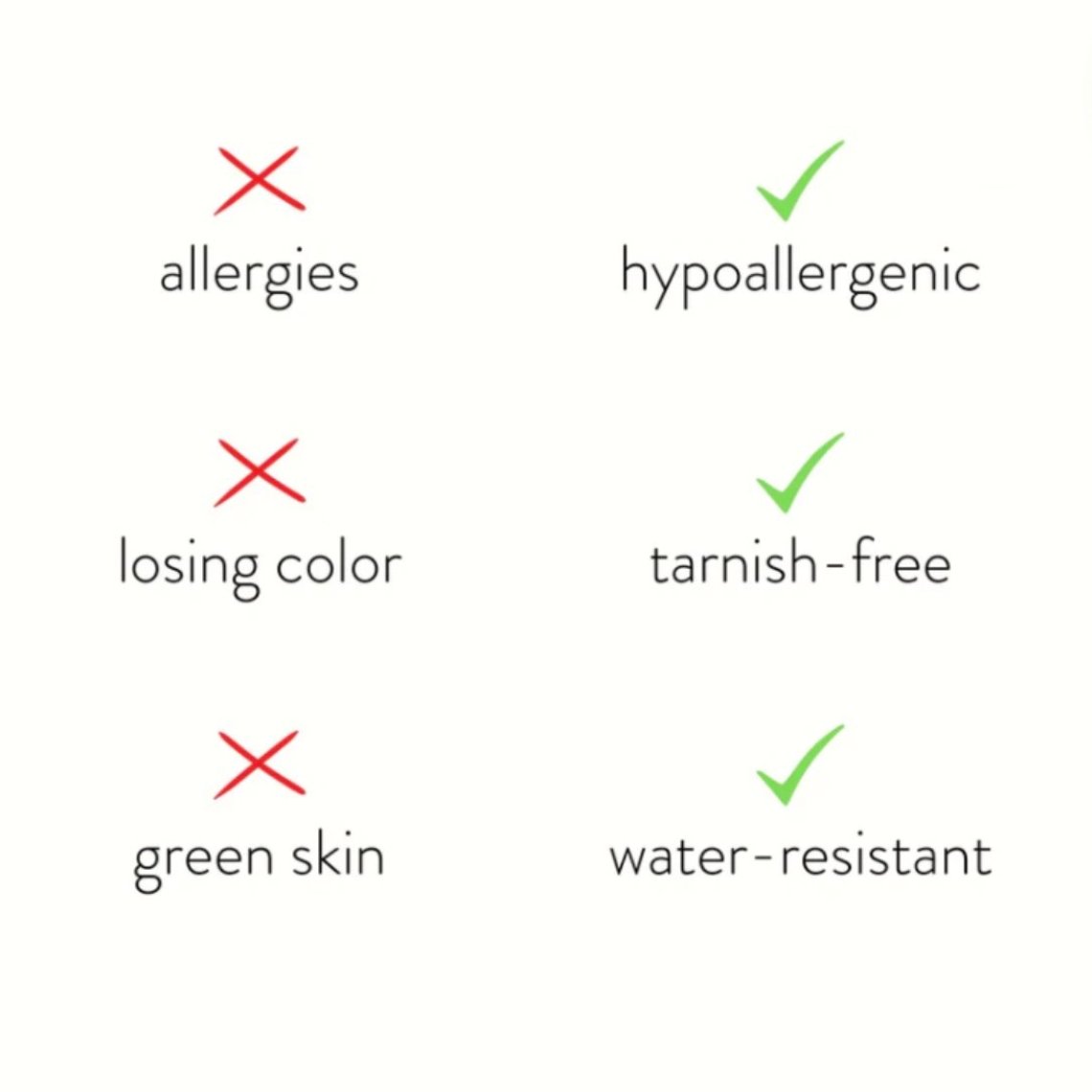 Fabriqué en acier inoxydable étanche, vous n'aurez plus jamais à vous soucier des doigts verts, des bijoux qui se décolorent ou qui ternissent !