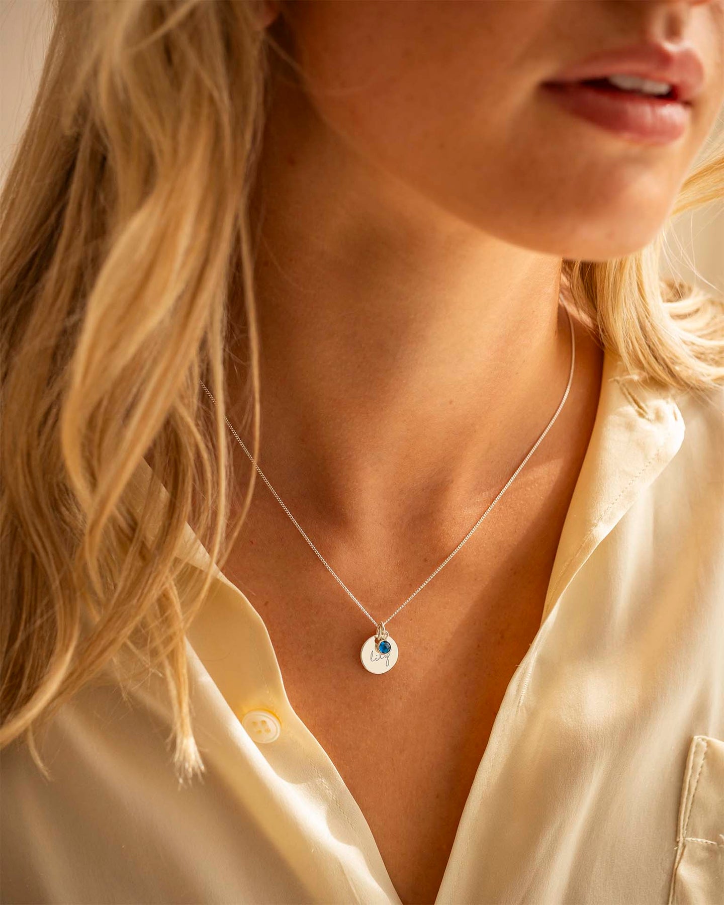 Le Collier Personnalisé Esme avec Nom et Pierre de Naissance en Argent Sterling présente un charm en disque hautement poli associé à un charm en cristal de pierre de naissance suspendu à une fine chaîne.