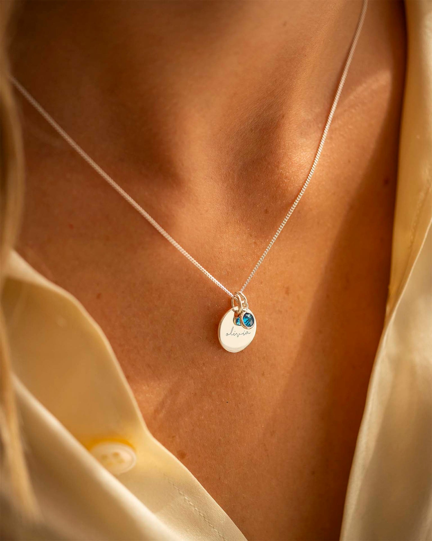 Le Collier Personnalisé Esme en Argent Sterling présente un charm disque hautement poli associé à un charm pierre de naissance en cristal suspendu à une fine chaîne.