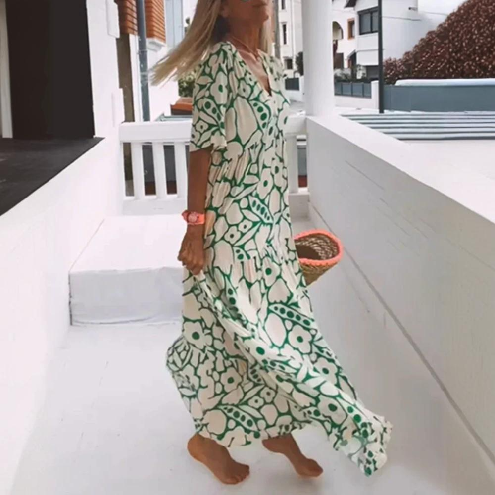 Cette magnifique robe est ornée d'un motif organique unique dans des tons de vert sur un fond clair, ce qui lui confère un aspect frais et naturel. L'élégante encolure en V et la coupe fluide et généreuse créent une sensation de légèreté et une silhouette flatteuse qui danse à chaque mouvement.