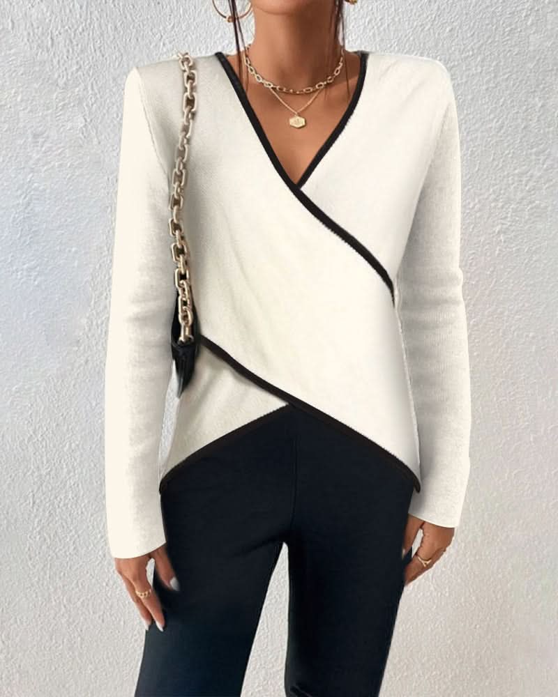 Le pull enveloppant Megan™ | Pull élégant à col en V allie sans effort sophistication et confort. Ce haut au design enveloppant élégant et au décolleté en V accentue votre silhouette de manière flatteuse, tandis que le détail contrastant ajoute une touche de modernité. Idéal pour les occasions formelles et décontractées, ce haut est un élément polyvalent indispensable de votre garde-robe. Portez-le avec un pantalon moulant ou une jupe et vous serez prête pour toutes les occasions, qu'il s'agisse d'une journée décontractée au bureau ou d'une soirée en ville